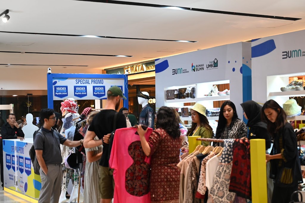 Booth kategori Fesyen pada Bazar UMKM untuk Indonesia periode September yang diselenggarakan oleh Kementerian BUMN bersama PLN dan Peruri di pusat perbelanjaan Sarinah, Jakarta dipenuhi pengunjung pada Sabtu (23/9). FOTO DOK PLN