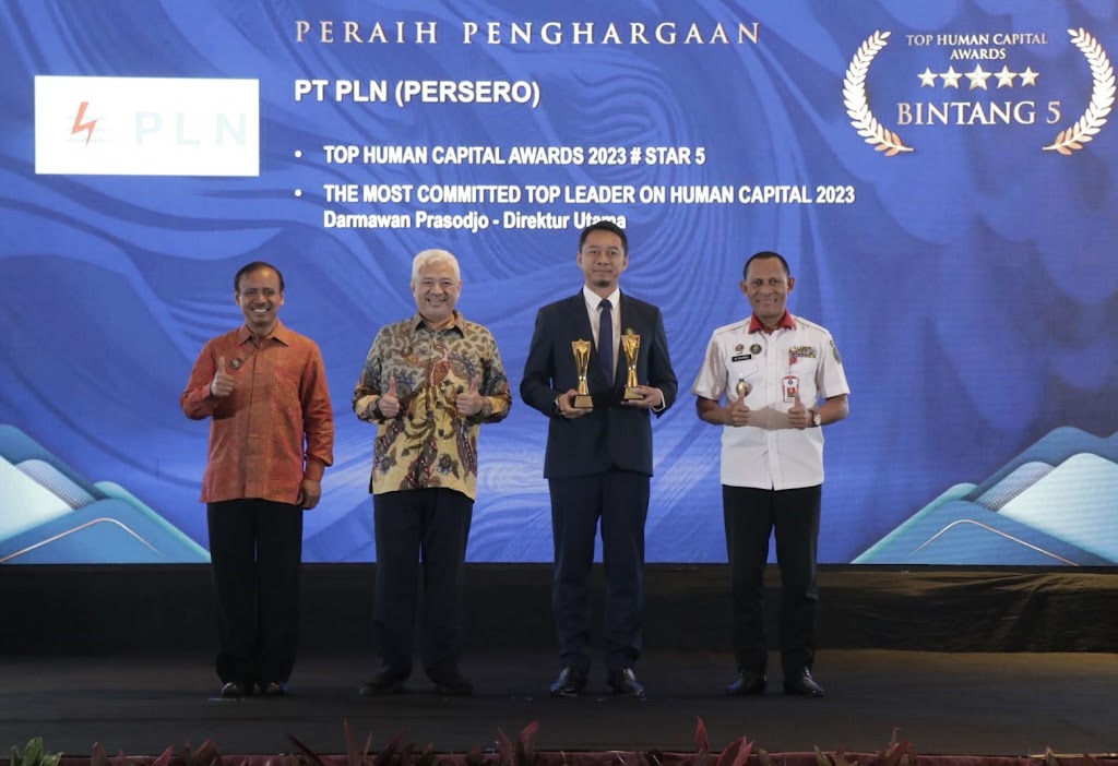 Penyerahan penghargaan Top Human Capital Awards 2023 Star 5 kepada Direktur Utama PLN, Darmawan Prasodjo untuk kategori The Most Committed Top Leader on Human Capital 2023 yang diwakili oleh General Manager PLN Pusdiklat, Rio Adrianto (kedua dari kanan). FOTO DOK PLN