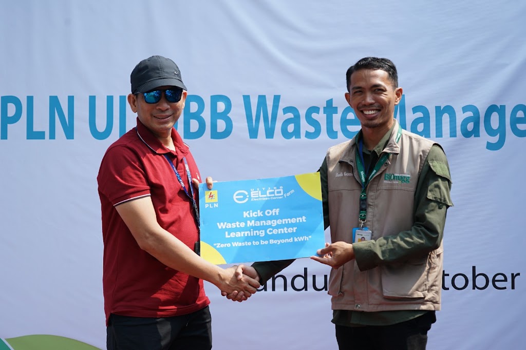 Hadi dari Biomagg (kanan) menyerahkan secara simbolis pengelolaan sampah organik kepada PLN UIT JBB yang diterima oleh Erwin Ansori GM UIT JBB. FOTO DOK PLN