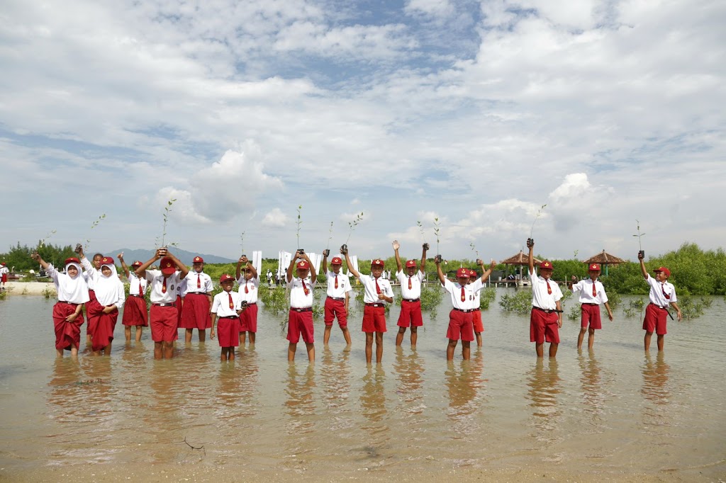 Antusiasme para pelajar Sekolah Dasar (SD) yang turut serta dalam aksi melestarikan lingkungan dengan melakukan penanaman mangrove yang merupakan salah satu program Tanggung Jawab Sosial dan Lingkungan (TJSL) PLN Peduli di kawasan konservasi Pasarbanggi, Rembang, Jawa Tengah. Total seluas 65 hektar wilayah di pesisir Jawa Tengah akan di tanami magrove kerja sama antara PLN bersama Pemerintah Provinsi. FOTO DOK PLN